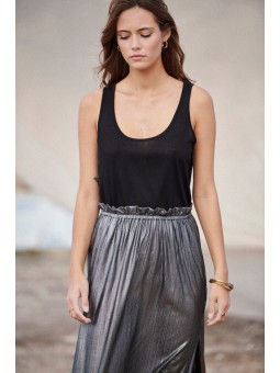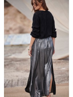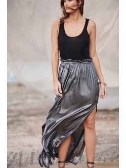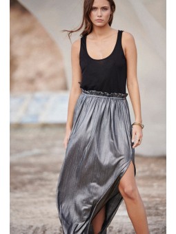 Cette jupe longue en lurex argenté fera fureur lors de vos soirées dété! Hyper confortable avec sa taille élastique, sa longueur parfaite et sa fente sur le côté vous donneront une prestance incomparable.