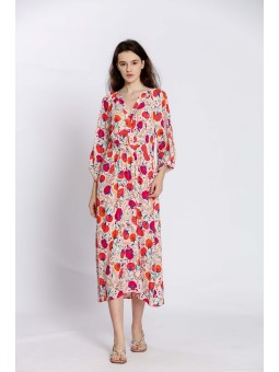 Cette robe fluide et élégante est faite pour vous faire briller. Elle est dotée d'un joli imprimé floral, d'un col tunique et croisé devant, et de manches 3/4. La taille est élastique et elle est faite en 100% viscose, ce qui la rend très confortable.