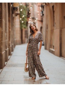 Combi-pantalon large aux jambes, imprimé d'un motif unique, doté d'un col en V et de boutons.