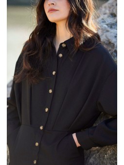 Robe courte à col classique, à manches longues et à patte de boutonnage au milieu devant. Découpée à la taille avec 4 plis sur le devant, elle est dotée de poches italiennes et d'un empiècement dos avec plis ronds dans le dos et fronces à la taille dans le haut du dos.