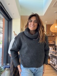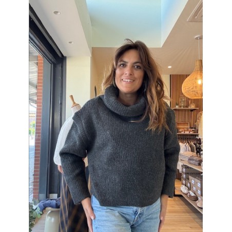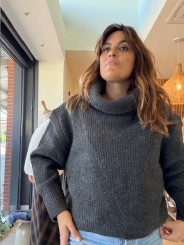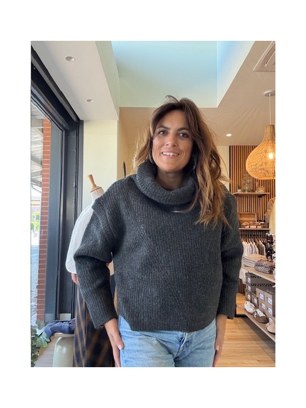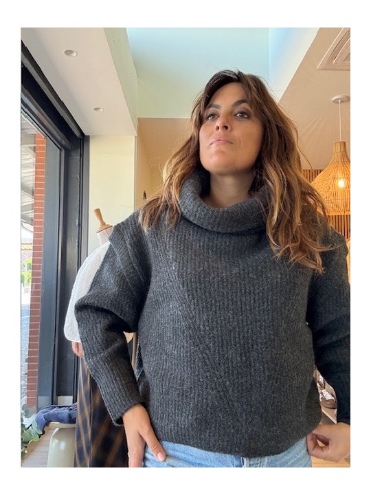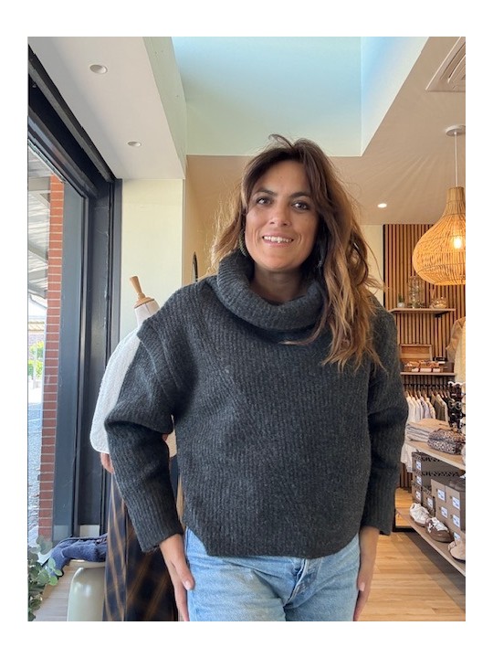 Avec son col roulé oversize ultra tendance, sa maille côtelée au caractère affirmé et ses manches structurées, il est la pièce phare de la saison.