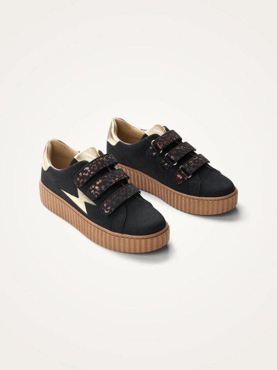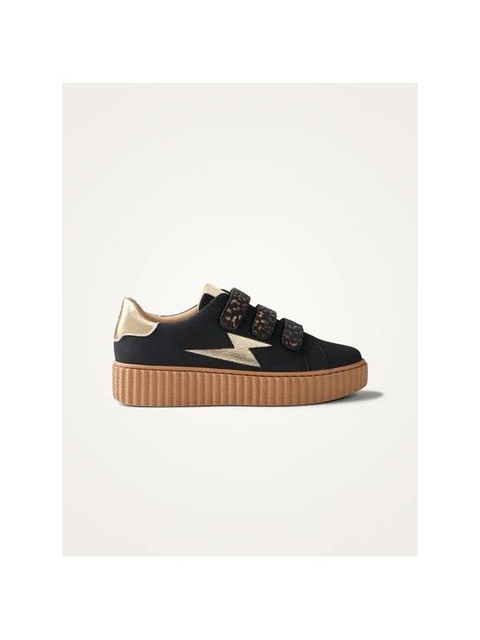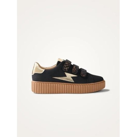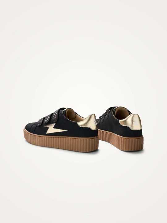 Sa base en suédine effet peau de pêche noire offre une texture douce et un look raffiné, tandis que la découpe en forme d'éclair et le patch arrière en similicuir texturé or insufflent une touche de lumière et de modernité.