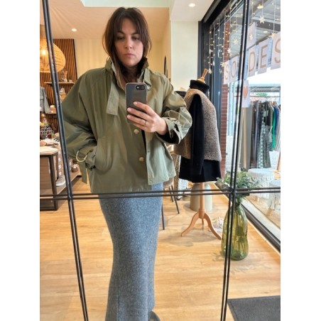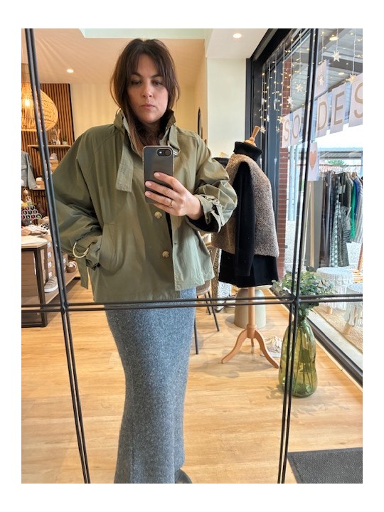 On craque pour ses détails travaillés : un col montant protecteur, une fermeture boutonnée élégante et des pattes de serrage à boucles dorées aux poignets qui permettent de jouer avec le volume des manches. Pratique et stylée, elle dispose de larges poches latérales pour un look utilitaire chic.