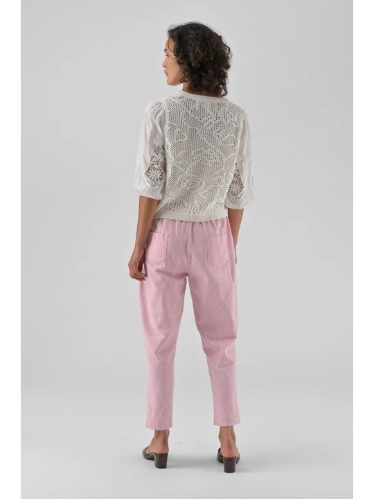 Gilet Bi-matière en Maille Ajourée et Manches Dentelle – Blanc Pur