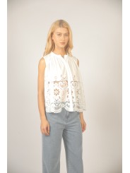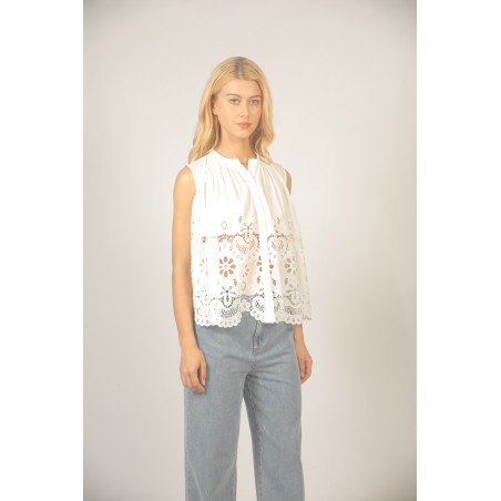 Ce top est la pièce maîtresse de vos tenues d'été. On aime le contraste entre son col structuré et le romantisme de ses motifs floraux ajourés. Sa coupe trapèze permet une grande liberté de mouvement tout en restant impeccable.