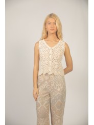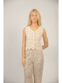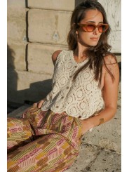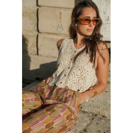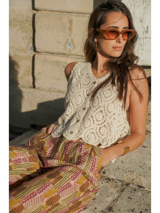 Véritable coup de cœur de la saison, ce petit haut sans manches capture l’essence du style bohème. Entièrement réalisé dans un crochet ajouré aux motifs circulaires délicats, il apporte une touche artisanale et vintage à votre garde-robe. Sa teinte écru naturelle et ses petits boutons façon bois en font la pièce idéale pour un look solaire et authentique.
