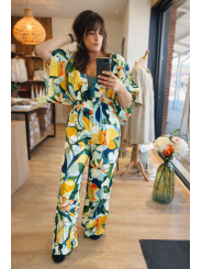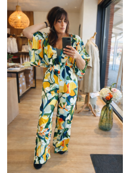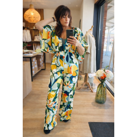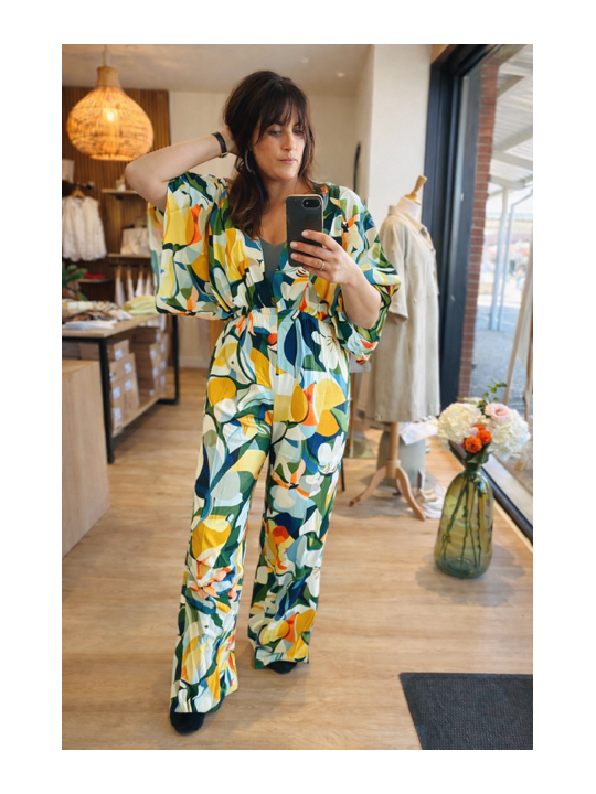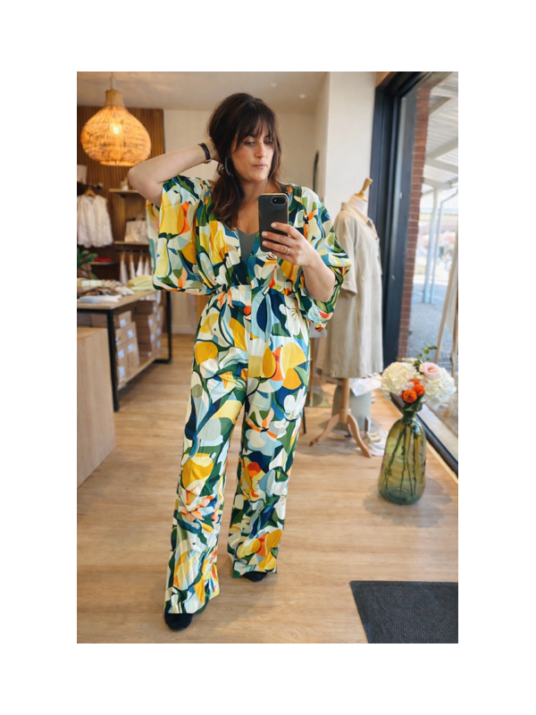 Osez la couleur et le style avec la combinaison Thalia signée Orfeo Paris. Véritable coup de cœur visuel, cette pièce unique se distingue par son imprimé graphique et vibrant, mélangeant des nuances de jaune soleil, vert émeraude et bleu azur.
